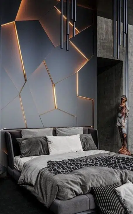 Voici d’autres exemples de têtes de lit originales qui auront tendance à attirer l’œil. Un fait à l’aide de lattes en bois. Ceux-ci partent de la tête de lit et continuent au milieu du plafond. Cela permet d’agrandir visuellement un espace. La deuxième tête de lit, plus contemporaine, voire futuriste, est destinée à être originale par son éclairage. En effet, cette impression de pièces collées les unes aux autres apporte ce côté « design ». La lumière n’est visible que dans les fissures. Enfin, cette troisième tête de lit, veut être plus gaufré. Ce contemporain noir ultra mat s’intègre parfaitement dans une pièce industrielle, vintage et contemporaine.