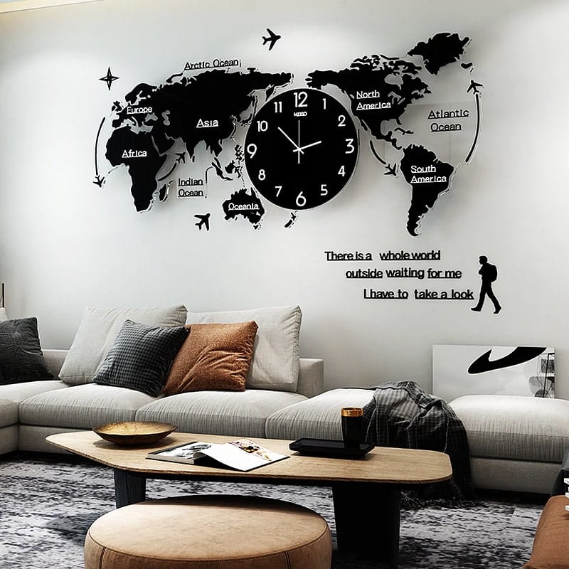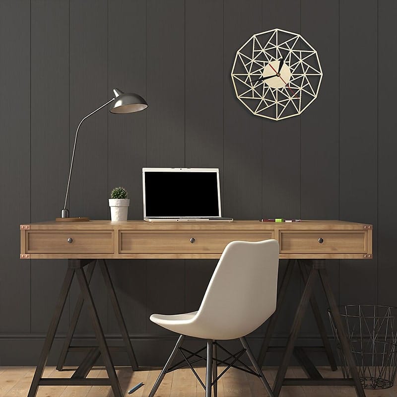 Pour un bureau, la sobriété est souvent de mise. Gris, noir ou blanc s’intègrent à merveille et donnent à la pièce une touche professionnelle. Si vous souhaitez voyager depuis votre fauteuil, une horloge murale carte du monde permet de garder un œil sur plusieurs fuseaux horaires, et donne à votre pièce une dimension d’ouverture.