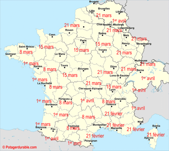 - Est, Nord, Belgique, Luxembourg, Suisse et zones montagneuses : entre le 15 mars et le 1er avril